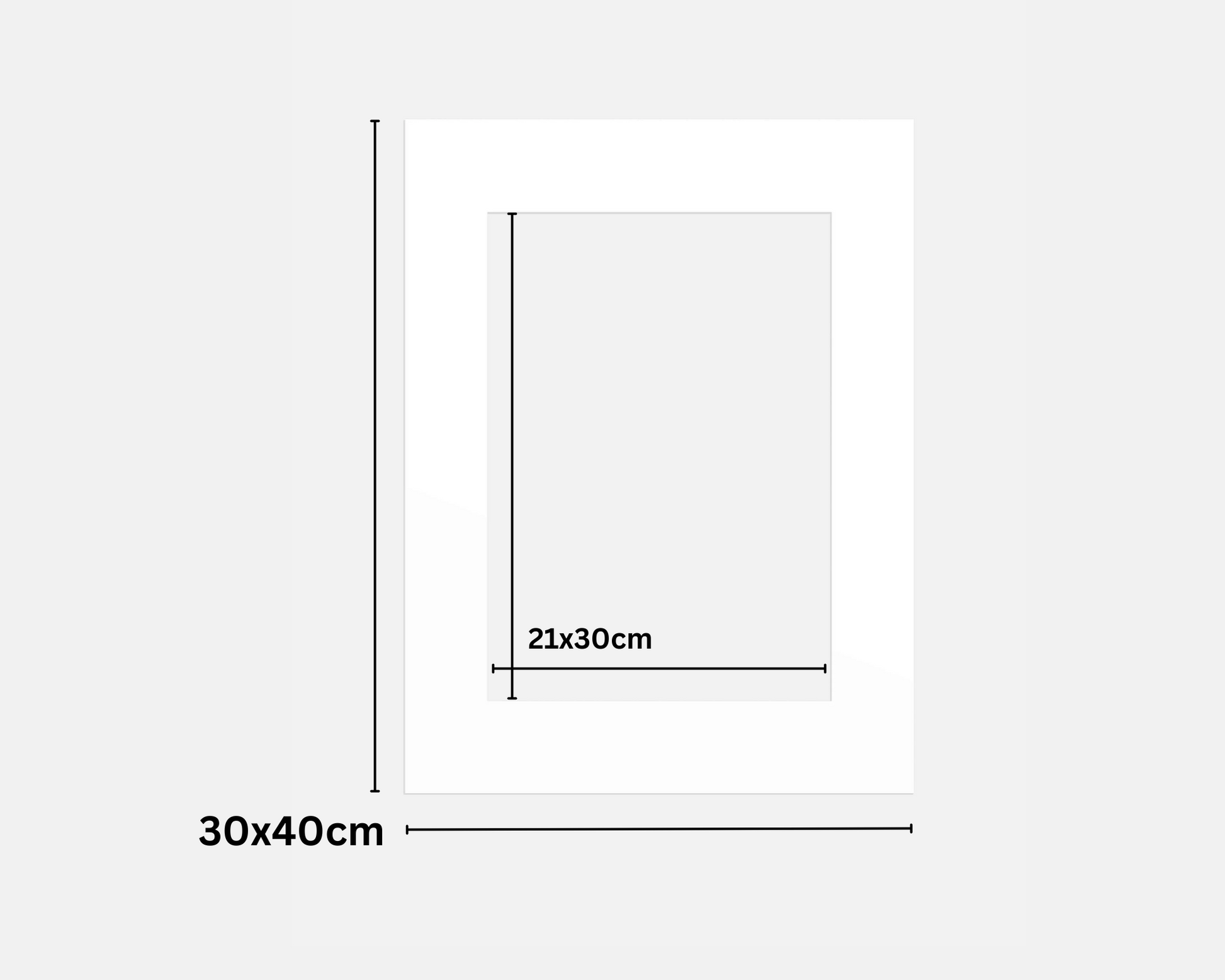 Hochwertiges weißes Passepartout mit weißem Kern und einem Schrägschnitt (45°) für Rahmen der Größe 30x40 cm. Innenausschnitt des Passepartouts passend für Poster im Format 21x30 cm (genaues Ausschnittmaß 20x29 cm).